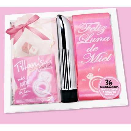 KIT EROTICO FELIZ LUNA DE MIEL / Contenido: Anillo Retardante Silicona, Vibrador lady, Cinta Antifaz, Juego 2 Dados (36 Combinaciones) / Medidas:22x19x3 cm