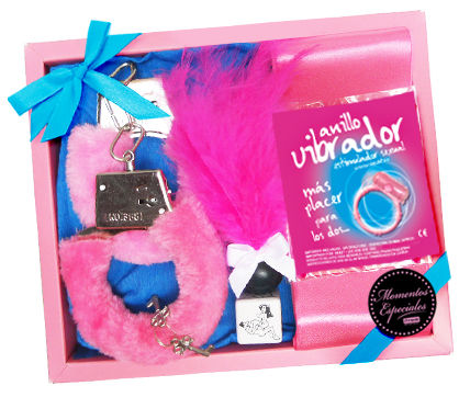 Contenido: Esposas, llaves, plumero, anillo vibrador, cinta antifaz, Dado erótico posturas.