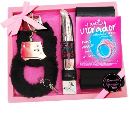 Contenido: Esposas y Llaves, Vibrador, Cinta Antifaz, Anillo Vibrador Estimulante, Dado erótico Posturas